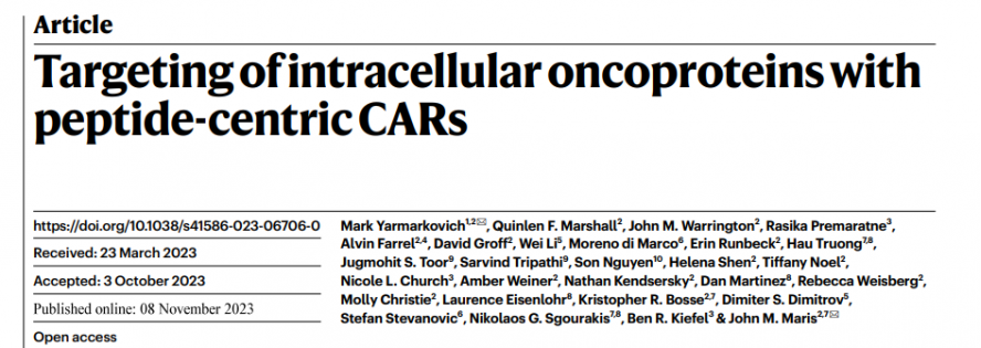 CAR - T cell tumor immunotherapy has demonstrated strong anti-tumor efficacy in hematological tumors such as leukemia, but its application in the field of solid tumors is limited due to the lack of tumor-specific targets. Most oncogenic driver genes are intracellular proteins or nuclear proteins that the immune system can recognize only through antigen peptides presented by the major histocompatibility complex (MHC), which limits the ability to target individual human leukocyte antigens (HLA). Immunotherapy with heterotypicly presented mutant peptides (neoantigens). The latest new study "Targeting of intracellular oncoproteins with peptide-centric CARs" published in the journal "Nature" directly allows CAR T cells to target tumor cells through peptide fragments of unmutated and essential proteins presented by MHC I, in part. Relevant research content is described below.
