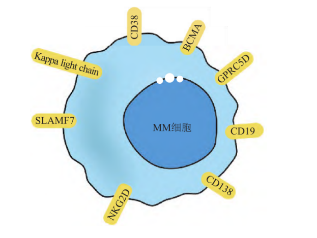 现在,B细胞成熟抗原(B cell maturationantigen,BCMA)、信号淋巴细胞激活分子家族成员F7(Signaling lymphocyte activation molecule familymember F7,SLAMF7)、G蛋白偶联受体C类第5组成员D(G protein-coupled receptor class C group 5member D,GPRC5D)等已被用作MM CAR-T治疗的靶点。现在市面上共获批3款靶向BCMA的CAR-T产品。其中BCMA CAR-T产品bb2121已于2021年3月被批准上市,2022年2月另一项产品cilta-cel也被批准上市,最新获批上市的是由我国驯鹿/信达生物共同开发的福克苏注射液,其他几种抗原的研究也在进行中。
